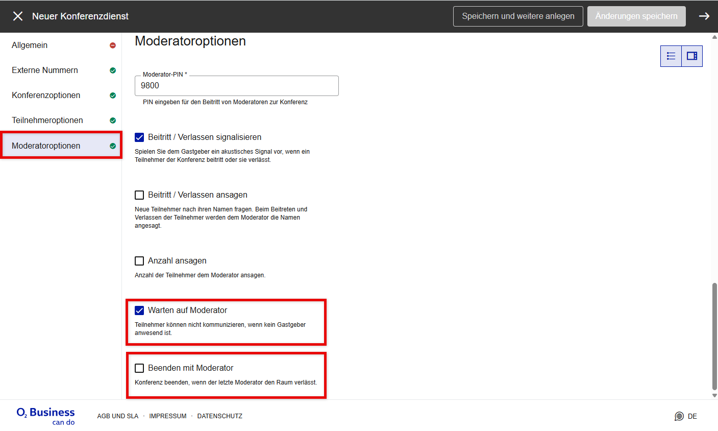 Ansage | Wählt die Ansage aus, die abgespielt wird, wenn ein Anrufer dem Dienst beitritt. Bitte beachten Sie, dass Sie nur Ansagen vom Typ Allgemeine Ansage auswählen können und nicht vom Typ Warteschleifenmusik. Denken Sie daran, dass das Feld zwar nicht obligatorisch ist, Sie aber immer eine Ansage auswählen sollten, die vom IVR-Dienst abgespielt wird. Andernfalls nimmt die O2-Cloud-Telefonanlage den Anruf zwar entgegen, spielt aber nichts ab. Das ist für den Anrufer verwirrend und kann zu Beschwerden führen. |