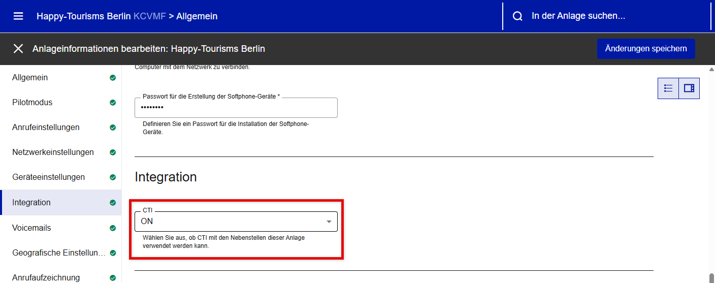 Unter Integration können Sie sehen, ob CTI an der Anlage aktiviert oder deaktiviert ist (schreibgeschützt). Um es auf einem Ziel zu aktivieren, muss diese Einstellung später unter Nebenstellen konfiguriert werden.