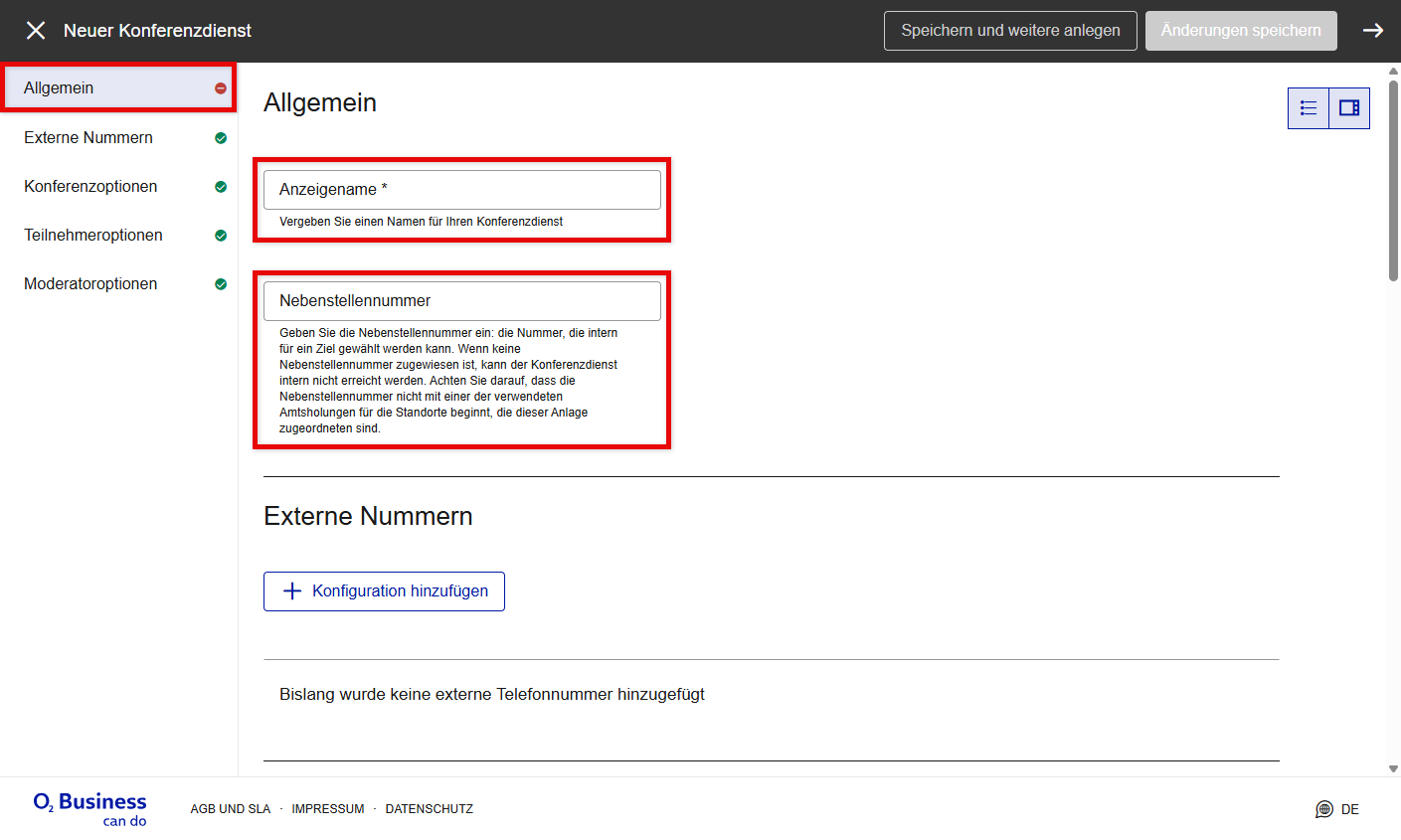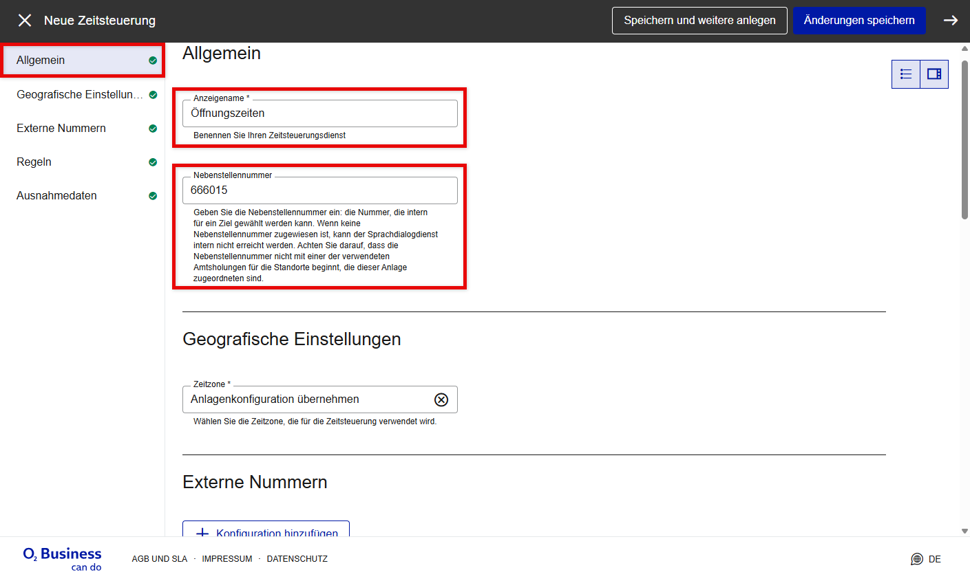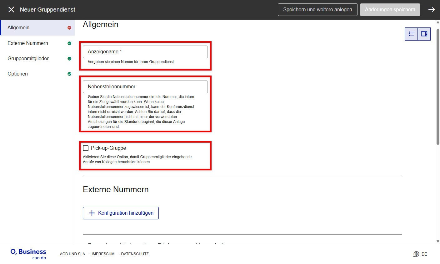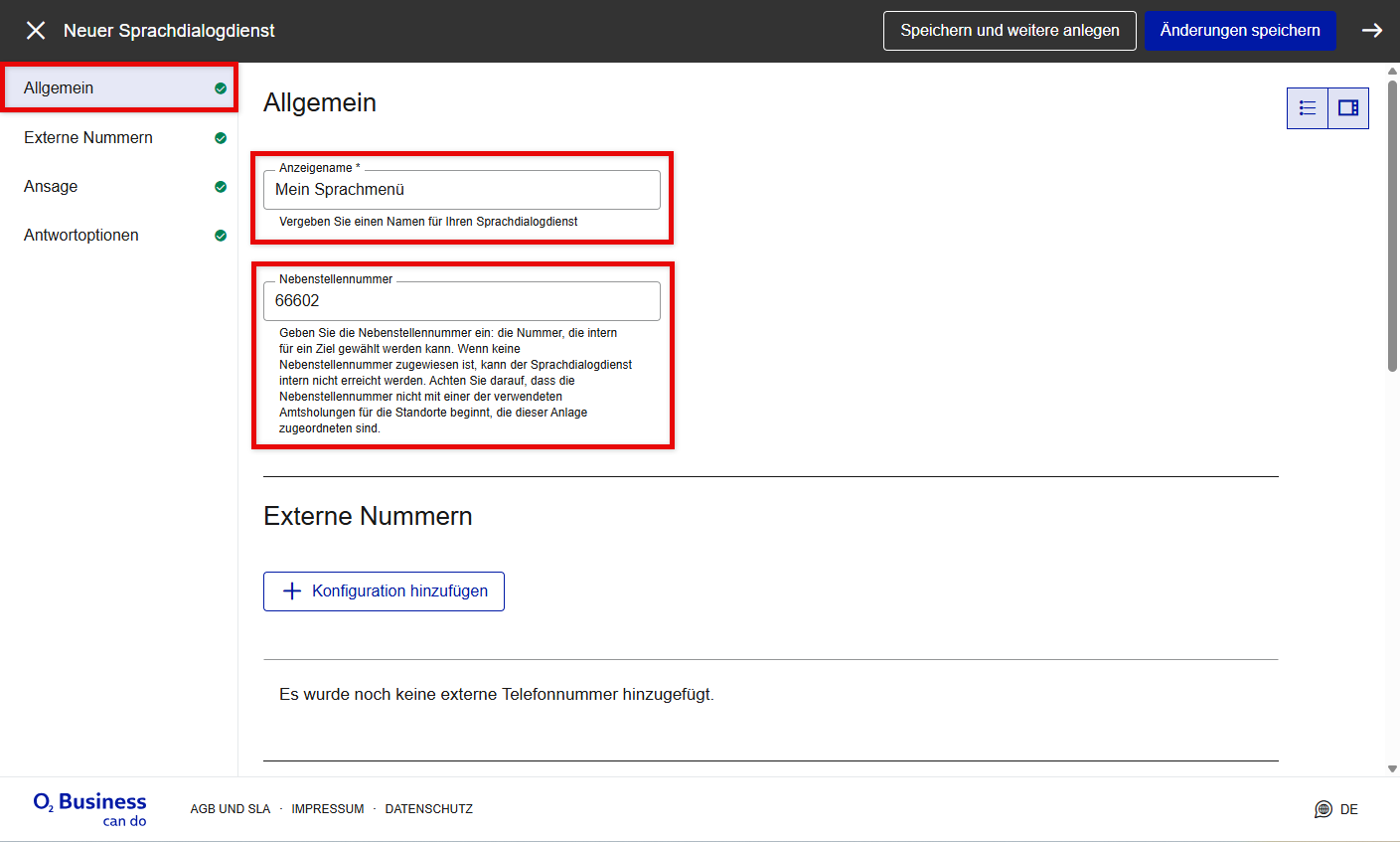 Unter Externe Nummern können Sie eine oder mehrere Durchwahlen (für eingehende Anrufe) zum Sprachdialogdienst hinzufügen.