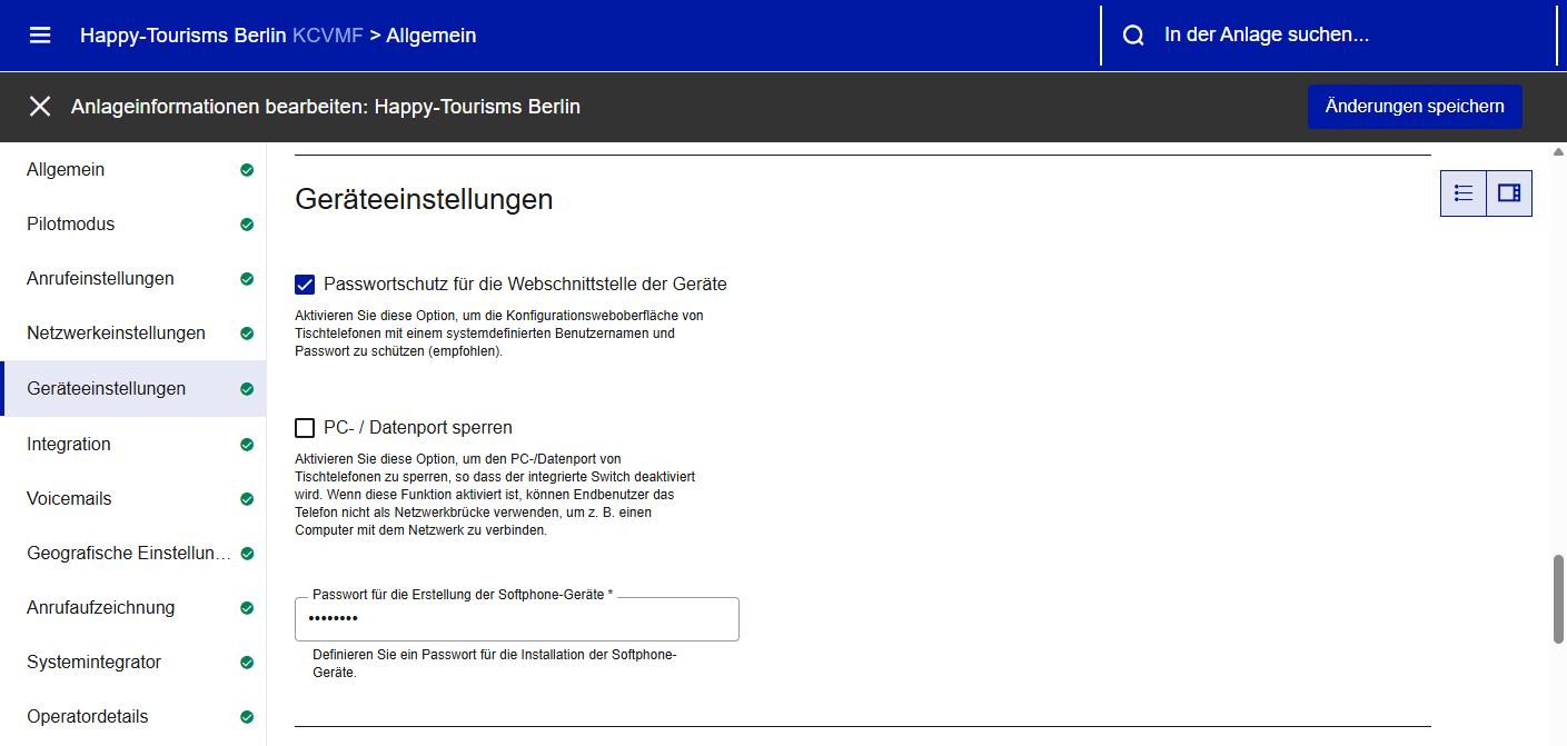Passwort für die Erstellung der Softphone-Geräte | Wenn Sie ein Softphone zum ersten Mal installieren, müssen Sie dieses Passwort während der Einrichtung anlegen, um die Installation zu autorisieren. Sie müssen dieses Passwort neu setzen, da das Standardpasswort unbekannt ist. |