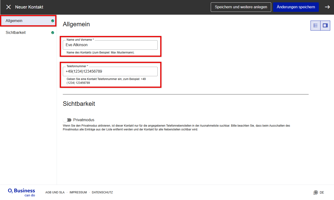 Privatmodus | Aktiviert / deaktiviert die Sichtbarkeitsbeschränkung eines Kontakts. Wenn der Privatmodus deaktiviert ist, ist der Kontakt für alle Nebenstellen sichtbar. Wenn er aktiviert ist, ist er nur für die in der Ausnahmeliste festgelegten Nebenstellen sichtbar (gilt auch für die Suche). |