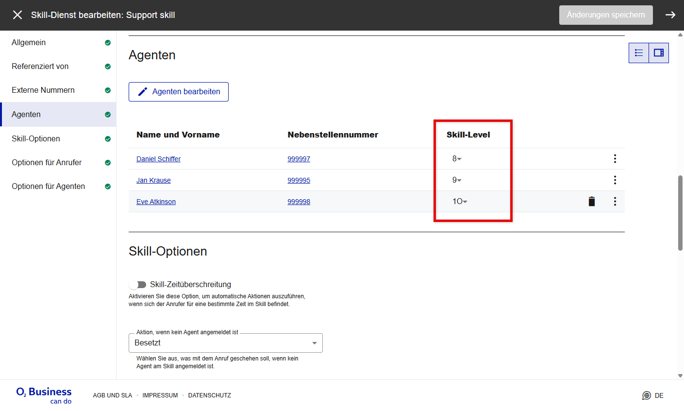 Unter Nebenstellen > Nebenstellen > Skills, können Sie einsehen, in welchen Skills ein Agent Mitglied ist. Ein Administrator kann über den Button den Agenten als Mitglied eines Skill-Dienstes aktivieren oder wieder deaktivieren, so dass der Agent keine Anrufe erhält, auch wenn er am Skill-Dienst angemeldet ist. "Am Skillset als Agent einloggen“ nimmt den Agenten in das Skill-Set auf. Wenn also ein Agent sich mit einem Sterncode vom Skillset abgemeldet hat, kann ein Administrator den Agenten mit dieser Option anmelden.