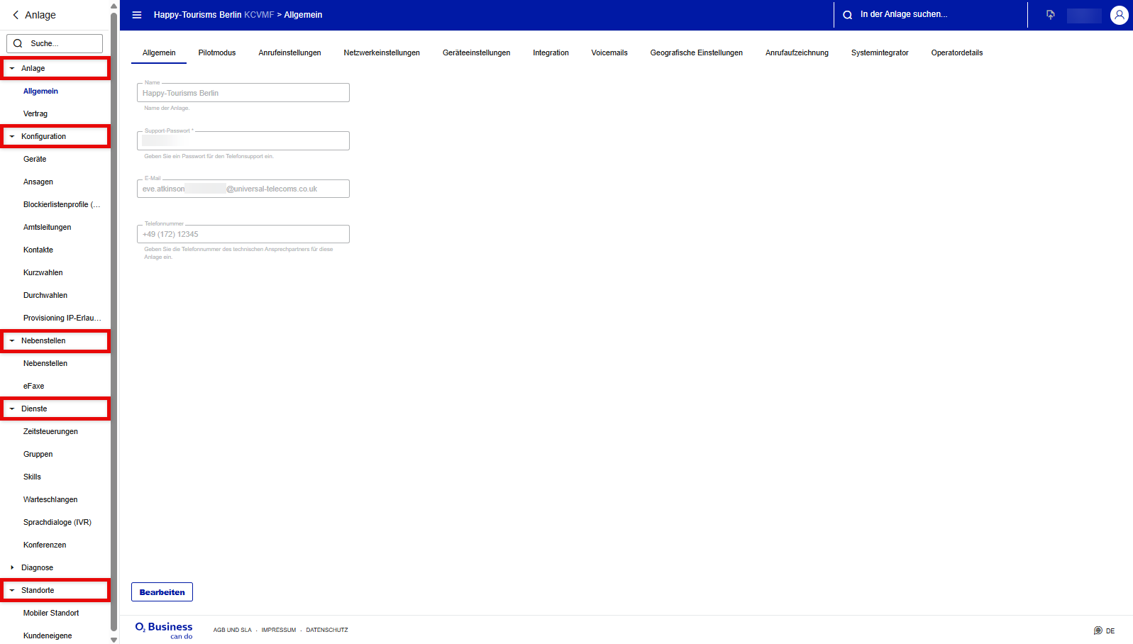 Support -Passwort | Das Passwort, das der technische Kontakt des Kunden beim Support-Team angeben muss, um nachzuweisen, dass er Zugriffsrechte auf das Konto hat. Wird bei der Erstellung der Anlage festgelegt, kann aber zu einem späteren Zeitpunkt geändert werden. |