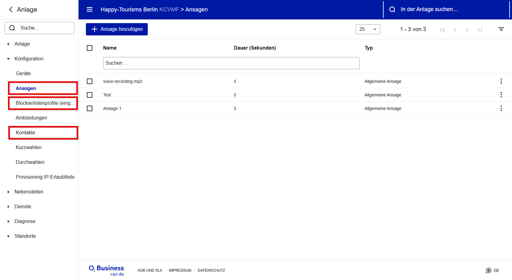 Unter Konfiguration > Ansagen können Sie eine Liste aller Ansagen einsehen, die an der Anlage hinzugefügt wurden. Bitte beachten Sie, dass Ansagen, die in anderen Bereichen der Konfiguration hochgeladen wurden, z. B. in einer Warteschlange oder einem Sprachdialogdienst, ebenfalls aufgelistet sind und in diesem Abschnitt verwaltet werden können.