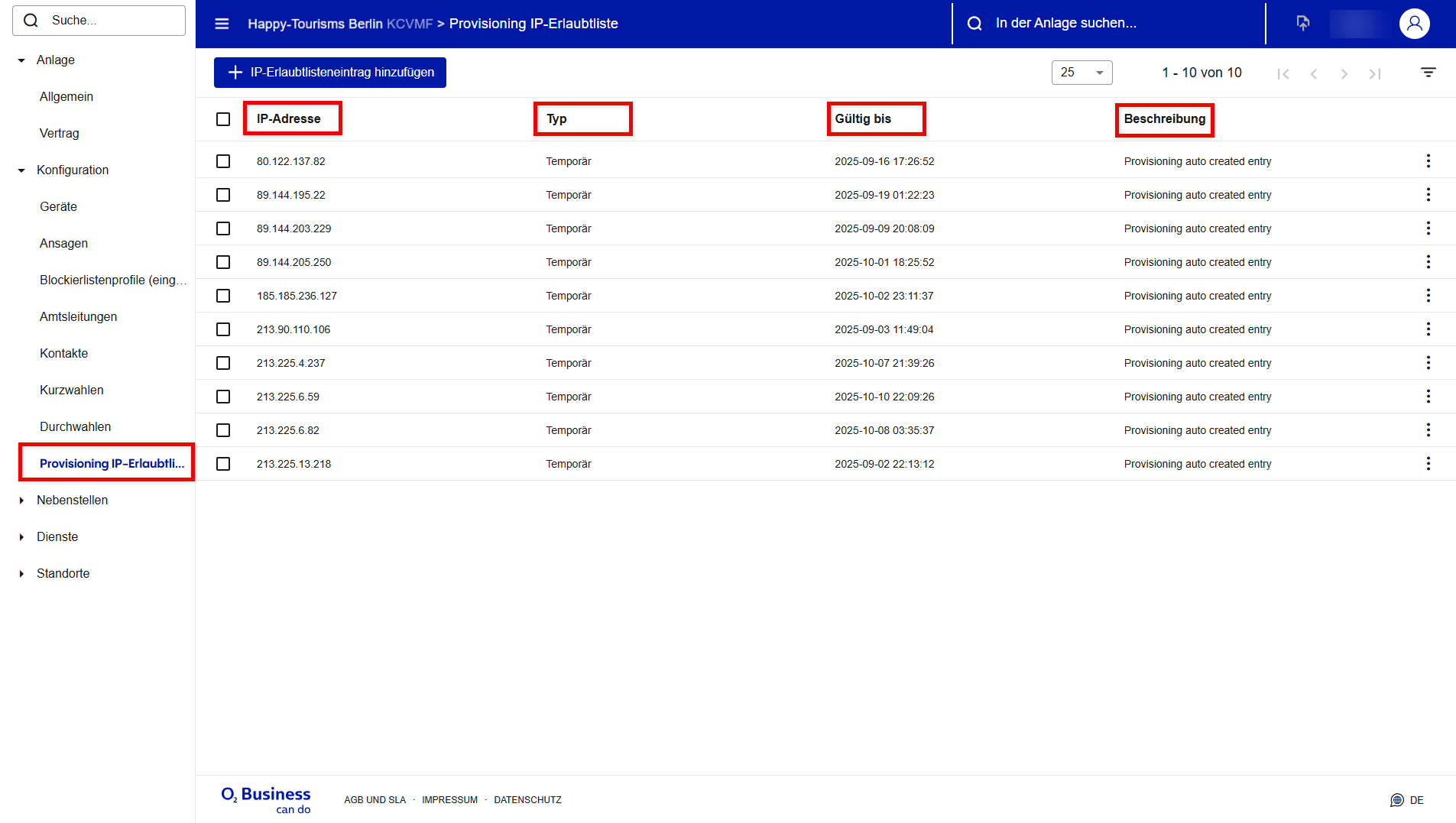 Konfiguration (Geräte, Ansagen, Blocklistenprofile für eingehende Anrufe, Amtsleitungen, Kontakte, Durchwahlen und Provisioning IP-Erlaubtliste)