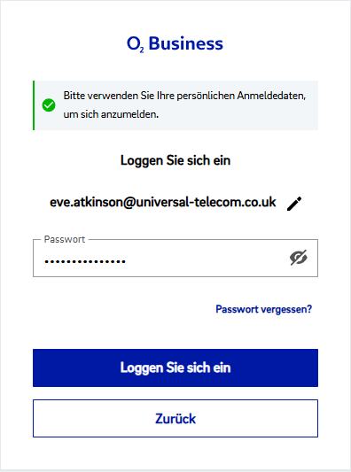 Geben Sie Ihren Benutzernamen (Ihre E-Mail) und Ihr Passwort ein (das Ihnen von O2 zur Verfügung gestellt wurde).