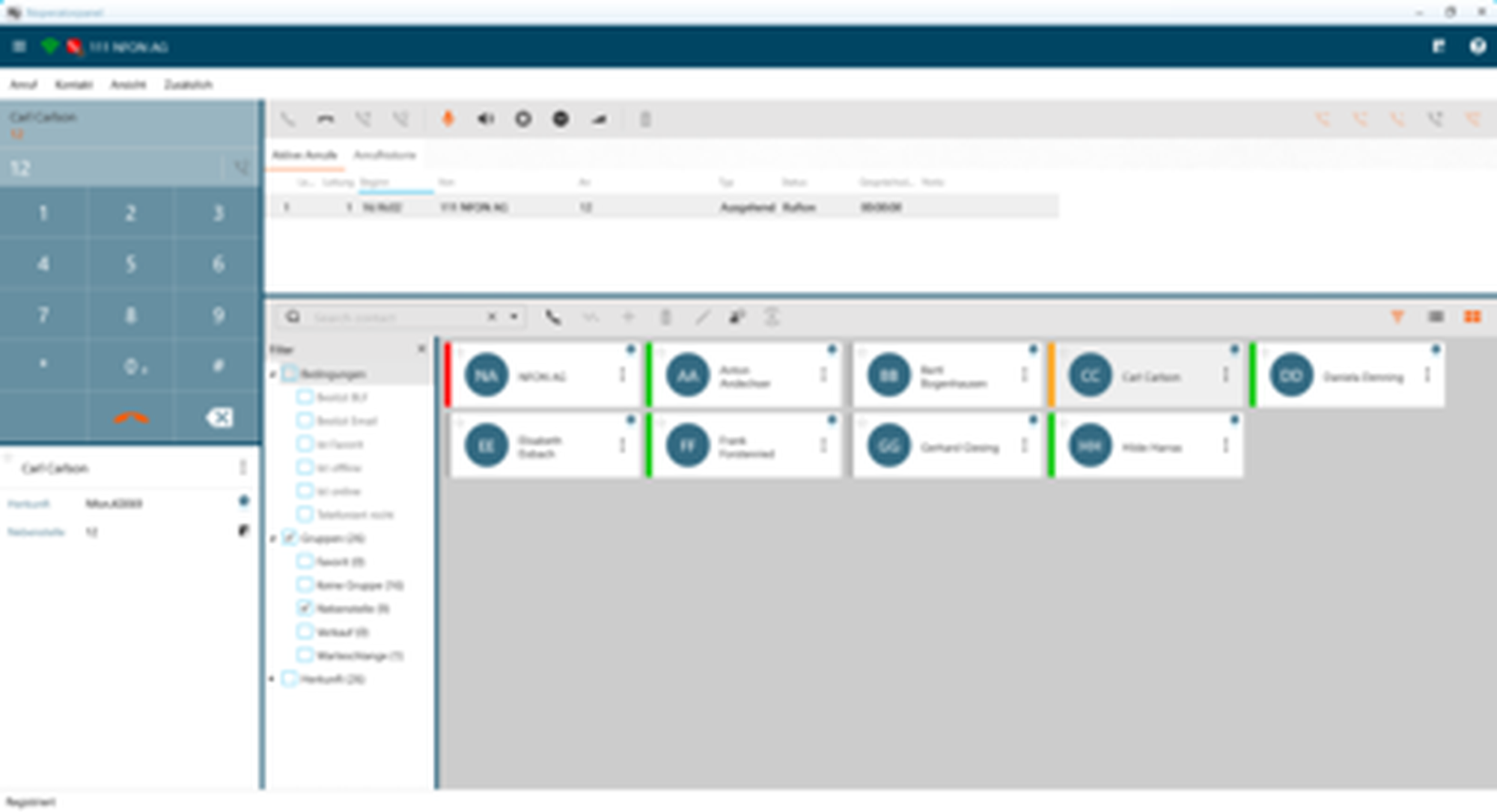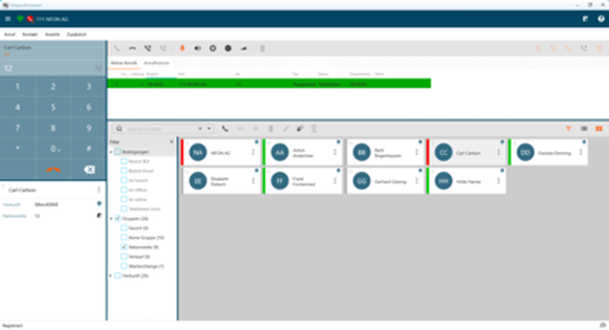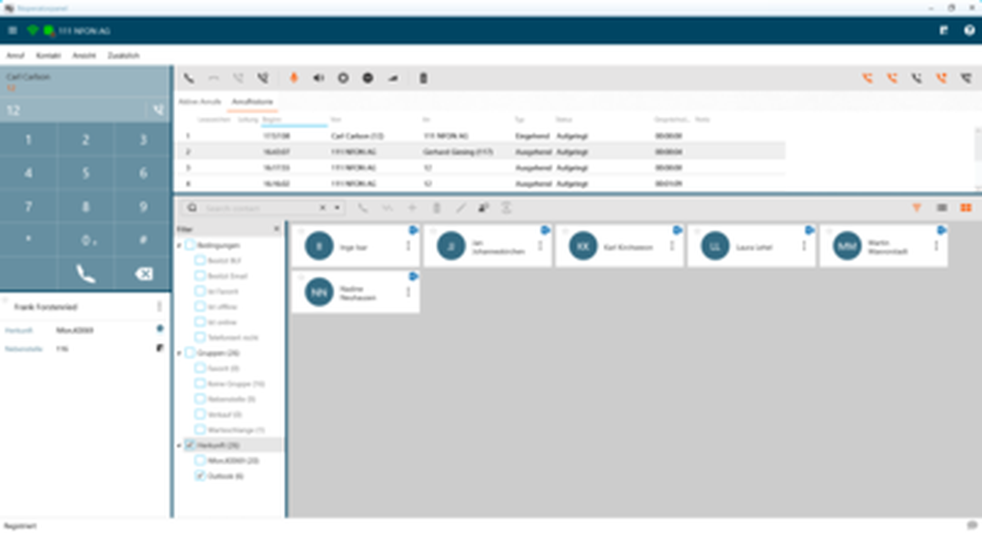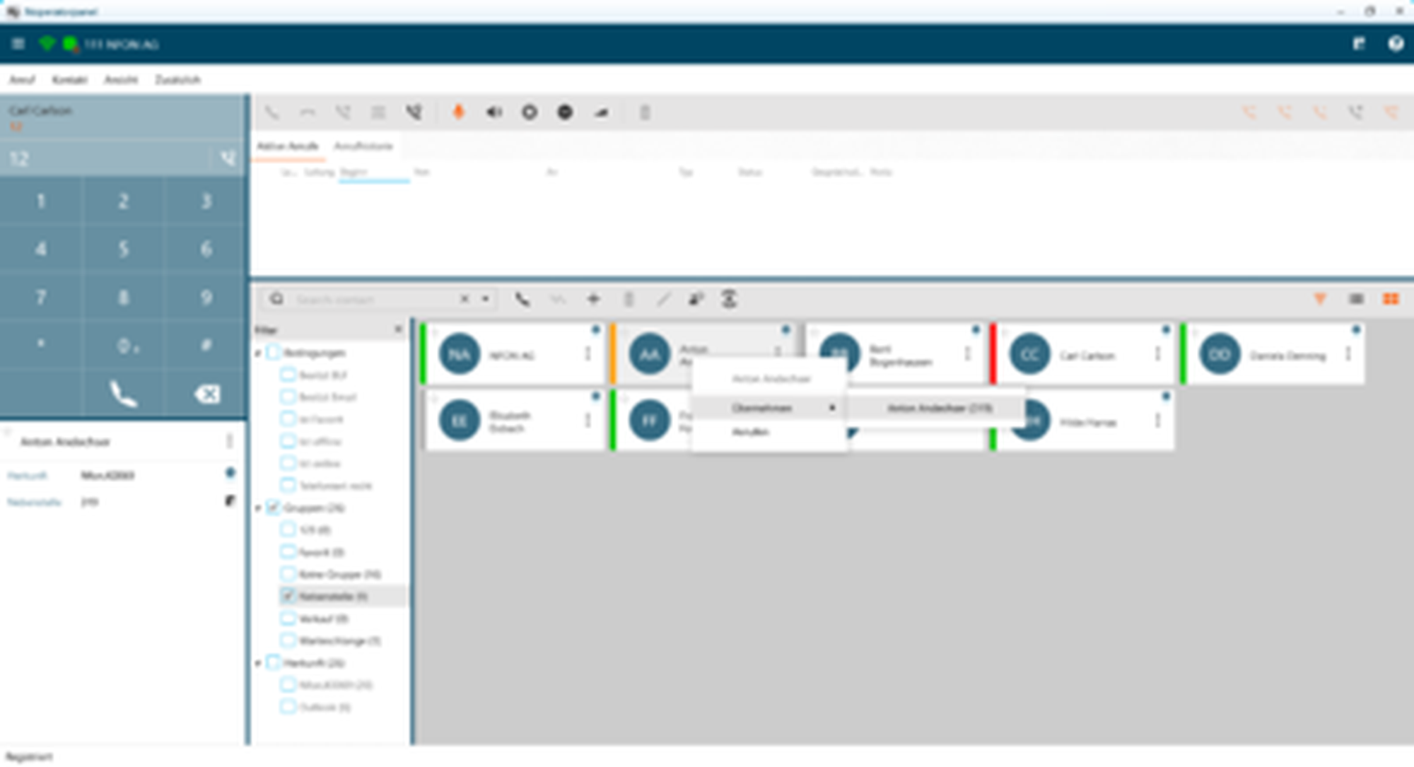 Eine Filterfunktion (unterhalb des Suchfeldes der Kontakte) ermöglicht es Nebenstellen, die einer erstelle Gruppen zugewiesen wurden, schnell zu finden und zusätzlich nach Bedingungen wie „Besitzt BLF“ und „ist online“ zu filtern.