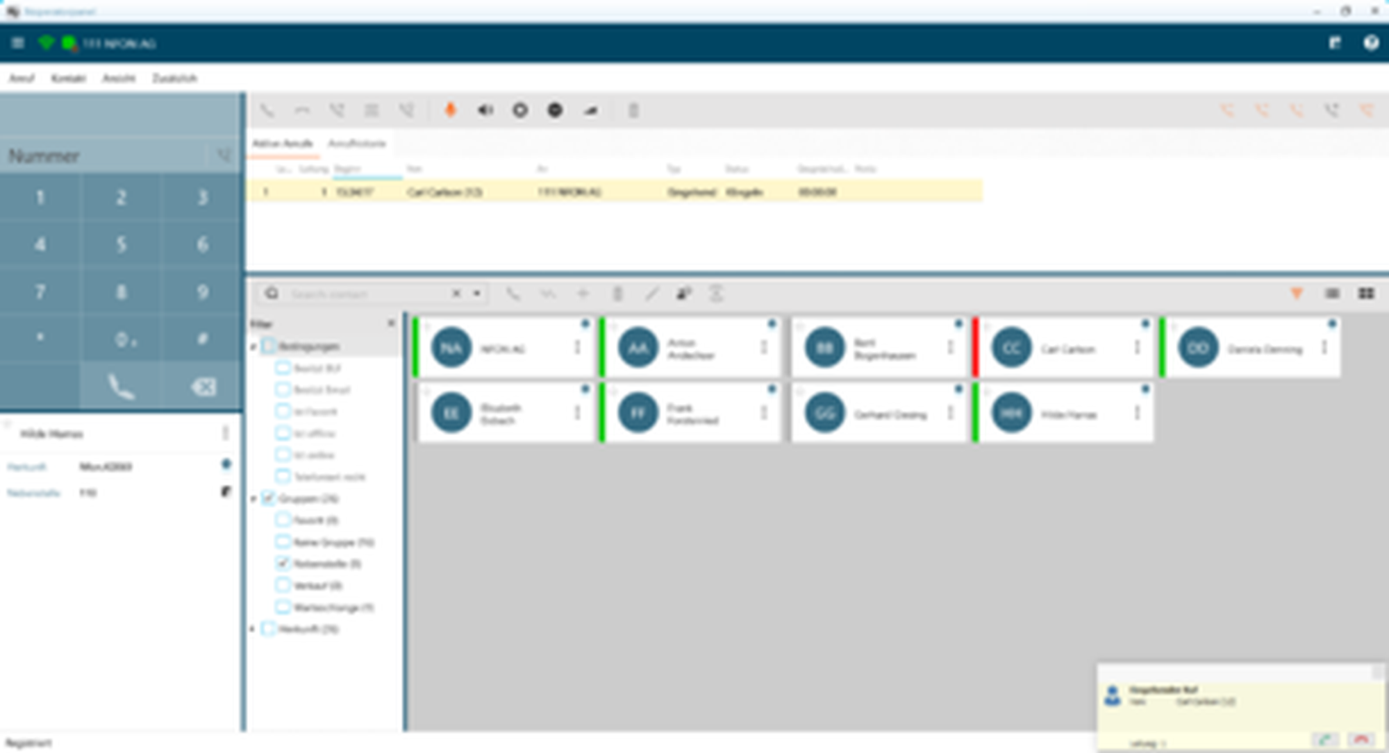Eingehende Anrufe werden unter „aktive Anrufe“ gelb gekennzeichnet und zusätzlich über das Pop-Up am unteren rechten Bildschirmrand angezeigt.