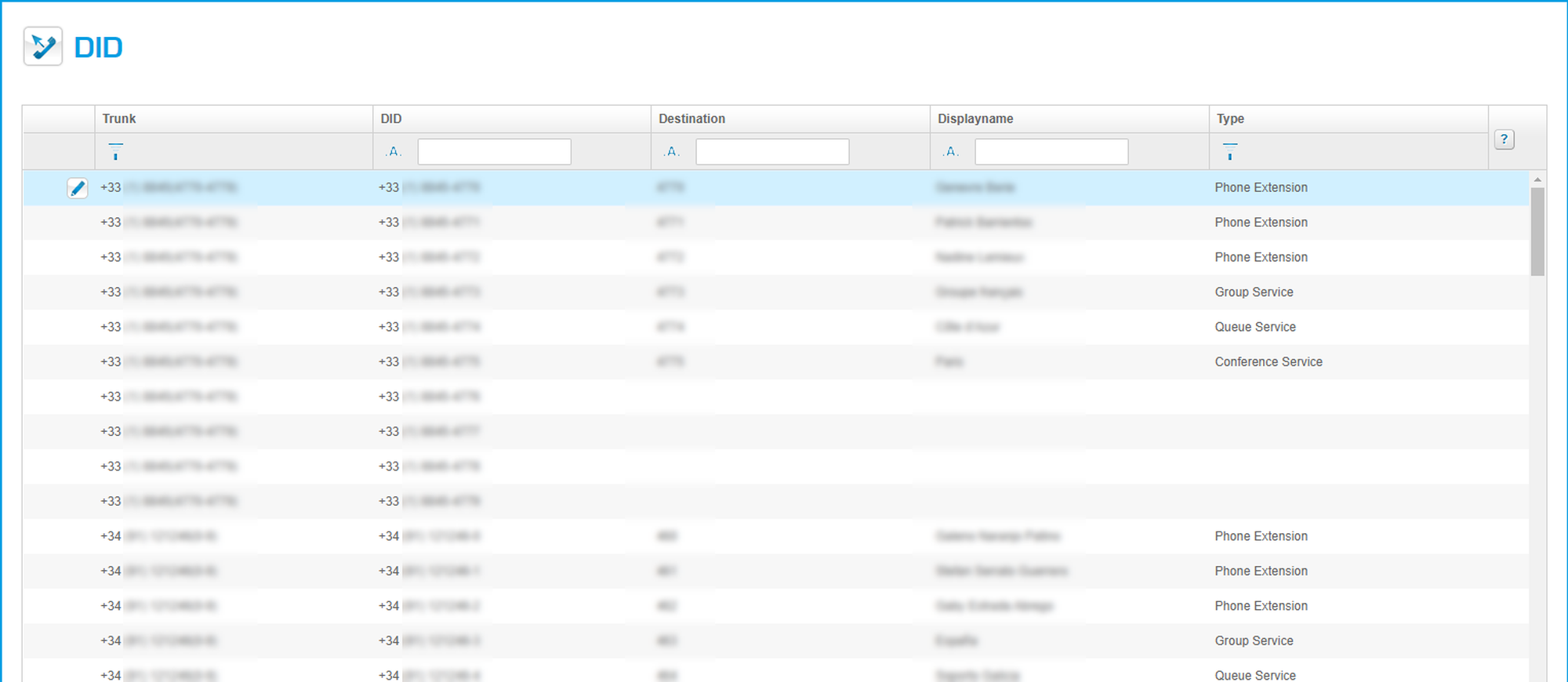 | DID | DID provides a quick overview of the telephone numbers configured for your system, the associated direct dial numbers and all existing extensions. Here, you can also change the assignment of telephone numbers for outside lines and link direct dial numbers with extensions or services. |